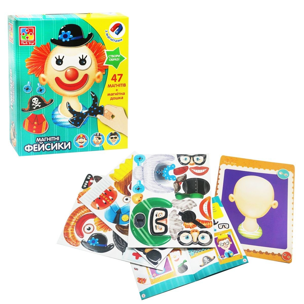 Цікава гра "фейсик". Можна міняти риси обличчя і аксесуари, і збирати різних персонажів. У наборі є 47 магнітів і магнітна дошка розміром 16х22. Для дітей від 3-х років.
