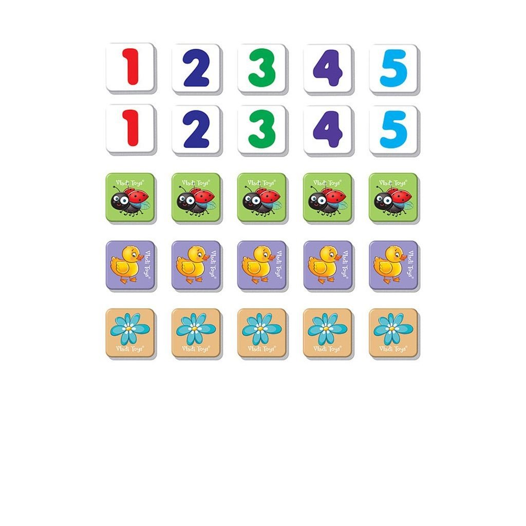 Набір складається з 25-ти магнітиків: 10 магнітів із цифрами та 15 магнітів із зображеннями комах, звірят і квіточок, які дитина зможе рахувати. Грати можна на холодильнику чи магнітній дошці. Набір допоможе малюкові в ігровій формі навчитися рахунку до 5-ти. Виготовлено в Україні.
