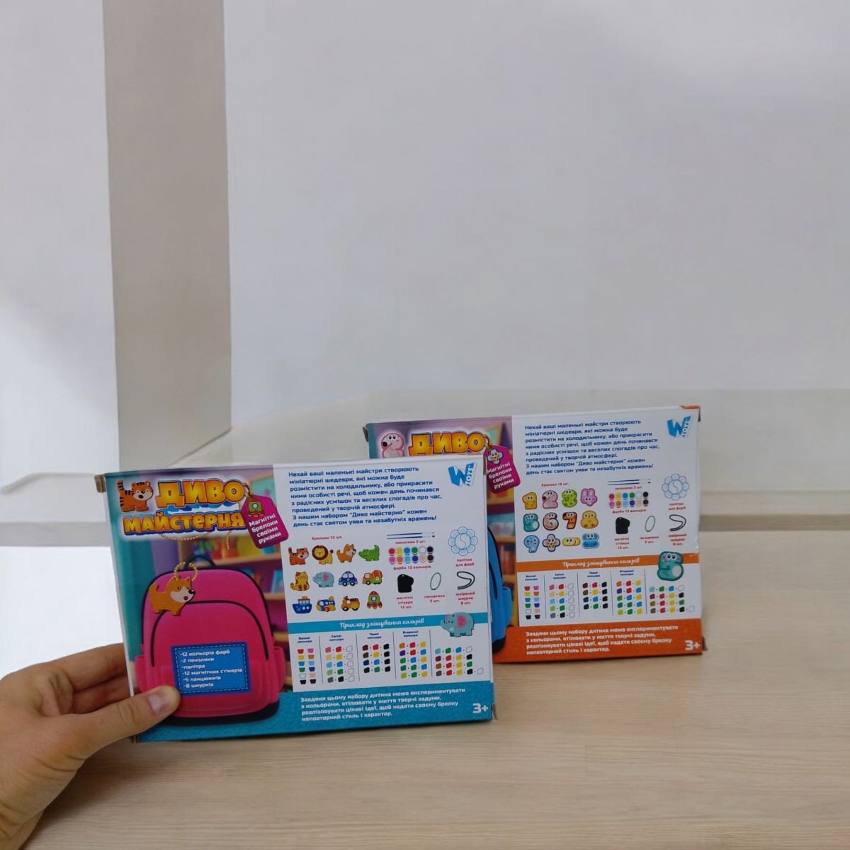 Нехай ваші маленькі майстри створюють мініатюрні шедеври, які можна буде розмістити на холодильнику, або прикрасити ними особисті речі, щоб кожен день починався з радісних усмішок та веселих спогадів про час, проведений у творчій атмосфері. У комплекті: 12 кольорів фарб, 2 пензлики, палітра, 12 магнітних стікерів, 5 ланцюжків, 8 шнурків.