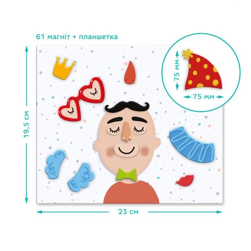 Набір магнітів "Обличчя" буде гарним подарунком для дитини. У наборі є 61 магніт із частинами обличчя та одягу для створення різних цікавих образів. Магнітики допоможуть малюкові створювати різні образи. У наборі є магнітне ігрове поле розміром 23х19,5 см з намальованим на ньому контуром обличчя. Набір виконаний із якісного матеріалу. Для дітей віком від 3-х років.