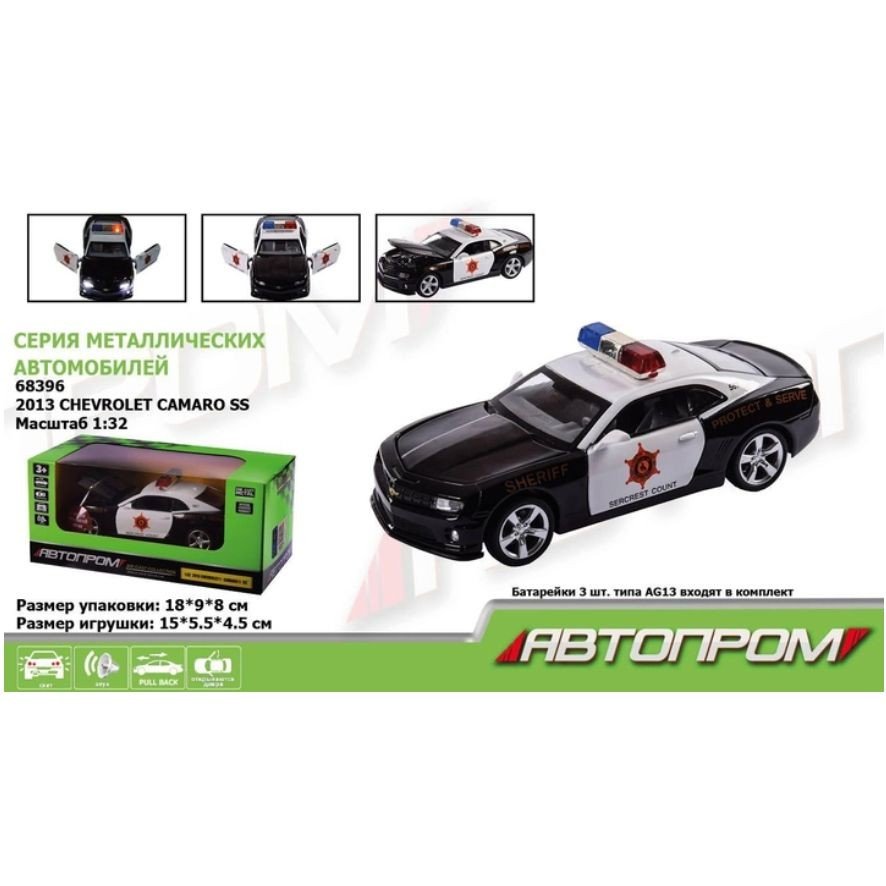 Машинка металева "Chevrolet Camaro 2013 SS-Police" із серії "Автопром". Модель дуже якісна та деталізована. Інерційний механізм, прогумовані колеса. Відчиняються двері, багажник та капот. Світло фар та реалістичні звукові ефекти. Масштаб автомобіля – 1:32.