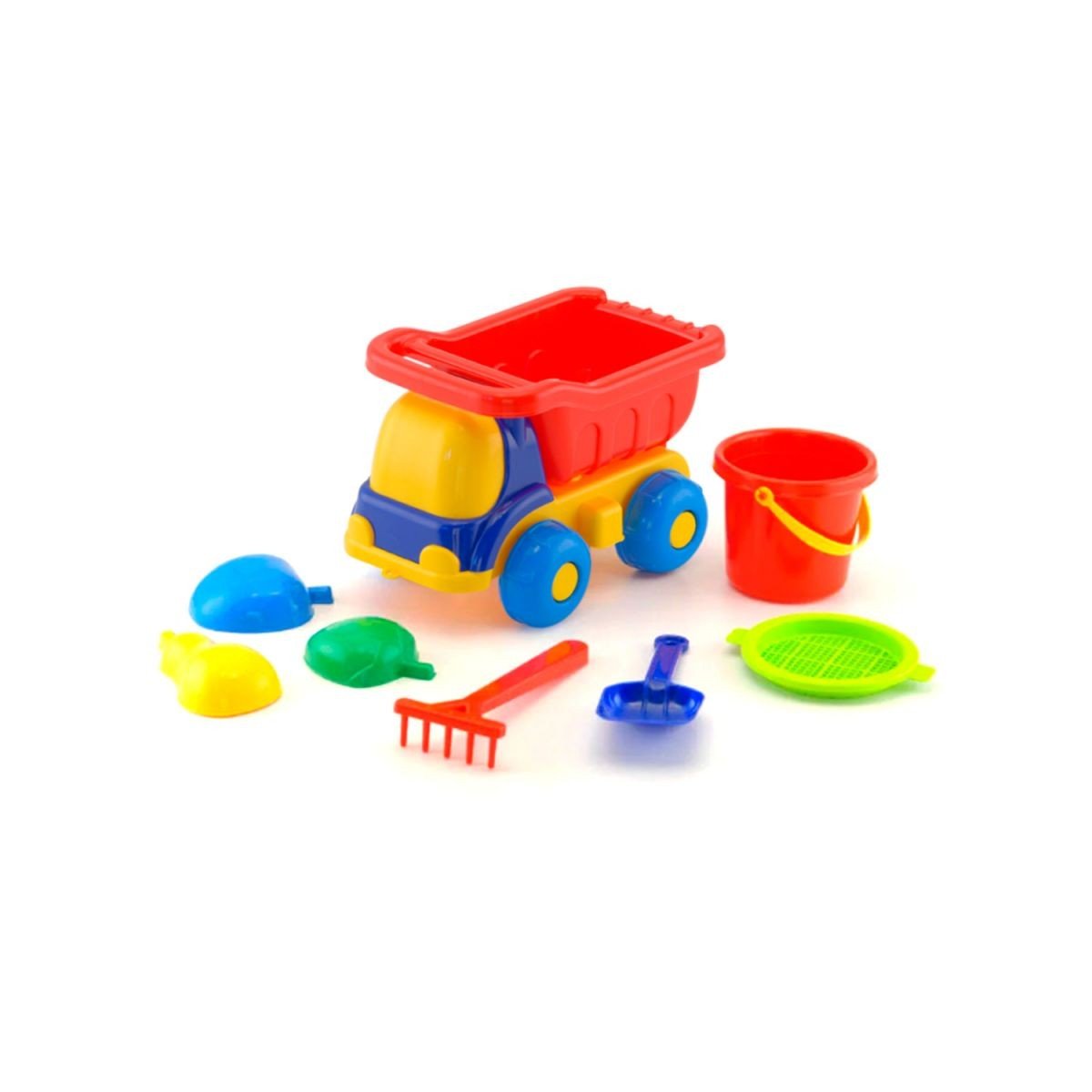 Машинка "Бджілка №3" з пісочним набором. У комплект входить: машинка самоскид з відкидним кузовом, відро з ситом, лопатка, граблі та 3 пасочки. З цим набором дитина зможе грати як вдома, так і на вулиці.