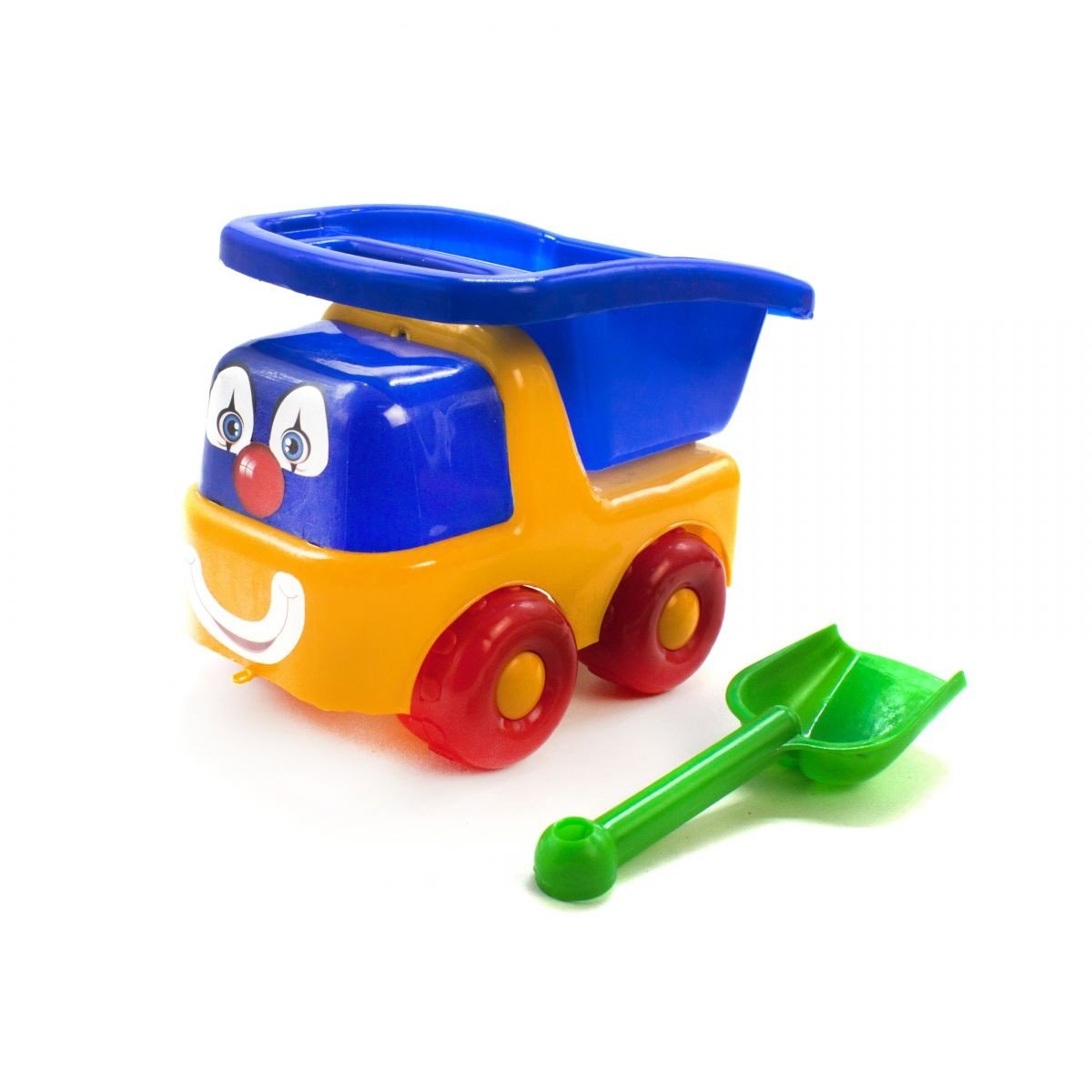 Яскрава пластикова машинка самоскид з відкидним кузовом. На передній частині машини зображено обличчя клоуна. Також в наборі є лопатка (17 см).