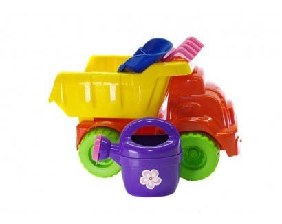 Яскрава пластикова машинка вантажівка з відкидним кузовом. Також в наборі йде леечка, лопатка і грабельки. У вантажівки великі колеса. Спереду є "петелька" для мотузочки.