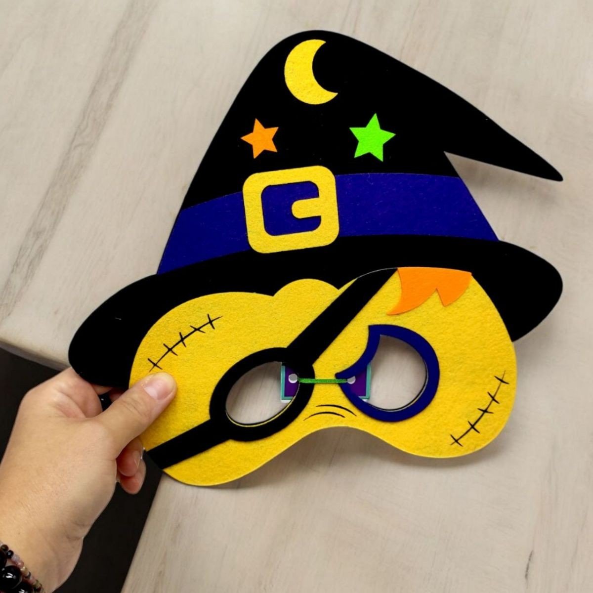 Дитяча фетрова маска на Хелловін - ідеальний аксесуар для святкового образу. Виготовлена з цупкого та безпечного для дітей матеріалу (фетр), ця маска легка та зручна у носінні. Містичний дизайн допоможе створити неповторний вигляд для веселих вечірок та тематичних заходів.