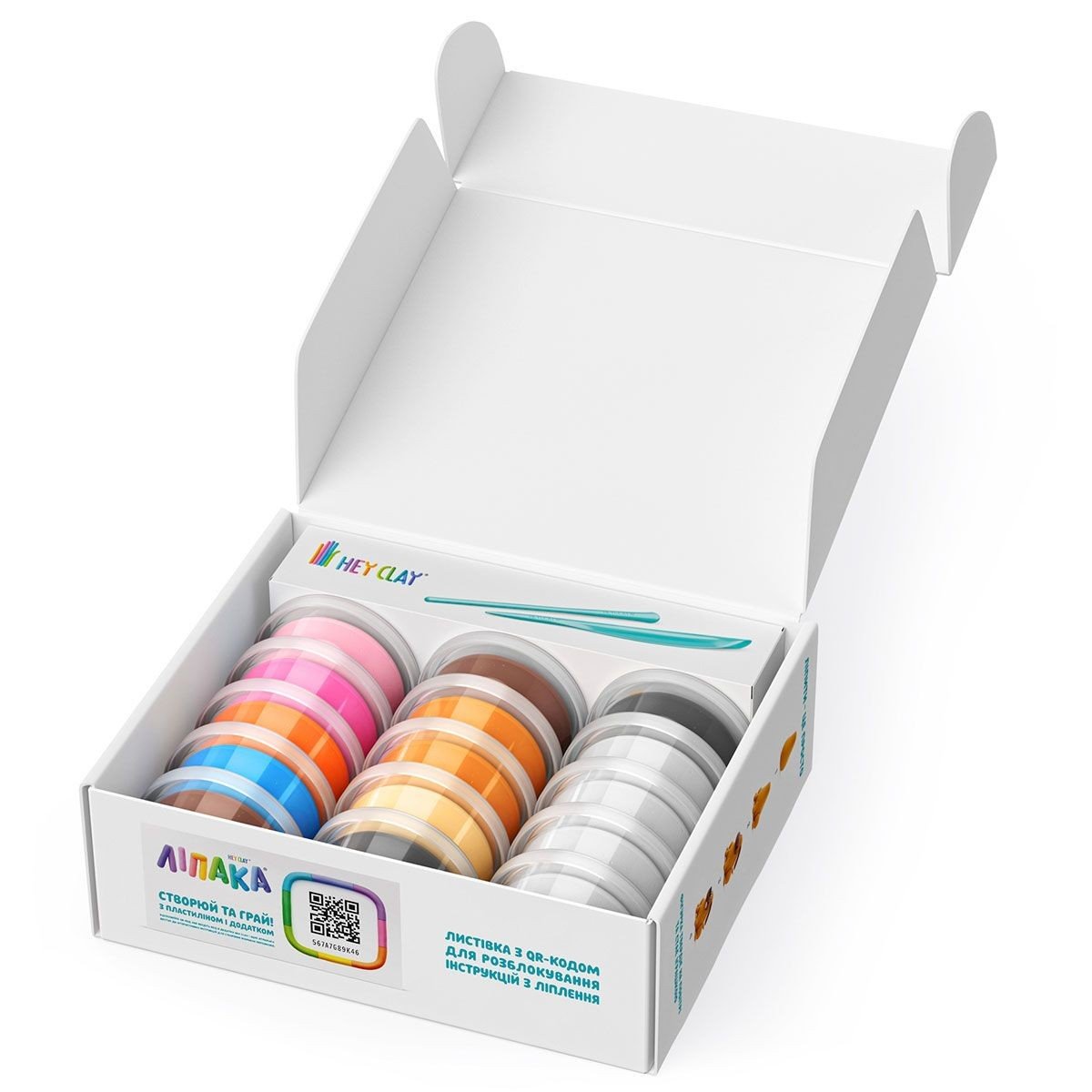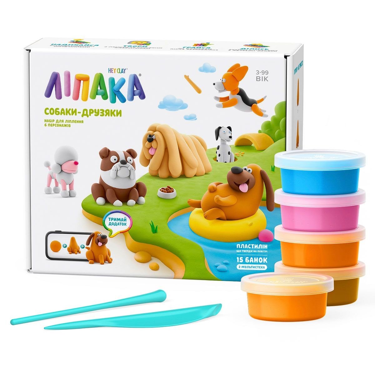 Меганабір пластиліну, що самостійно твердіє, розважить і малюків і дорослих. За допомогою анімаційних інструкцій в додатку "HEY CLAY" ви зможете зліпити 6 унікальних персонажів: Бігль Вокі, Бульдог Гіпно, Лабрадор Ням-Ням, Пудель Поппі, Комондор Муді та Далматинець Турбо. Пластилін твердіє на повітрі протягом 24 годин, після чого можна гратися створеними фігурками. До меганабору входить 15 баночок пластиліну різного кольору. В набір може входити до 9 різних кольорів (баночка може містити пластилін двох різних кольорів). Розімніть пластилін перед ліпкою! З пластиліну, що входить до набору, можна створити 6 персонажів, зображених на упаковці та описаних в інструкції (додатку). У кожному наборі ви знайдете код для доступу до відповідних героїв у додатку "ЛІПАКА HEY CLAY" з анімаційними інструкціями. Це унікальний додаток, з інтуїтивно-зрозумілим інтерфейсом, кумедною пластиліновою анімацією та інструкціями для малюків. Починаючи з простих форм та рухів, дитина з легкістю створить обраного героя, освоїть основні прийоми та техніки ліплення. Що, своєю чергою, сприятиме розвитку креативності та спонукатиме до створення власних шедеврів! Разом з пластиліном малюки розвивають дрібну моторику, вчаться концентрувати увагу, розвивають креативність та світогляд. Рекомендовано для дітей від 3 років.