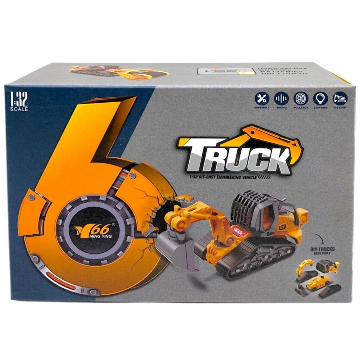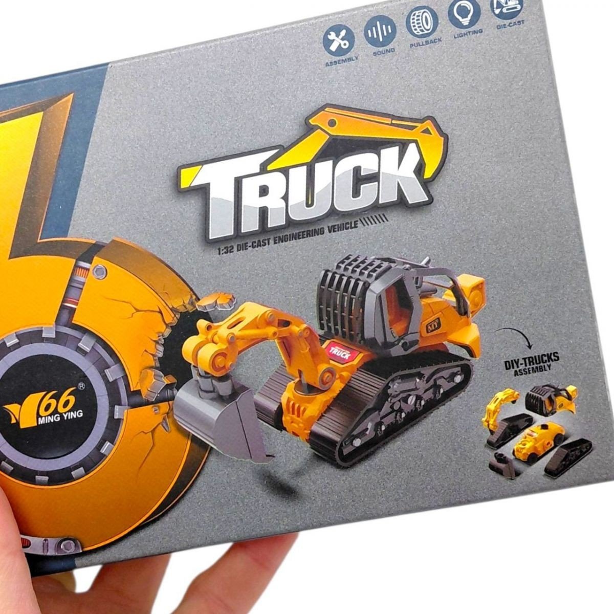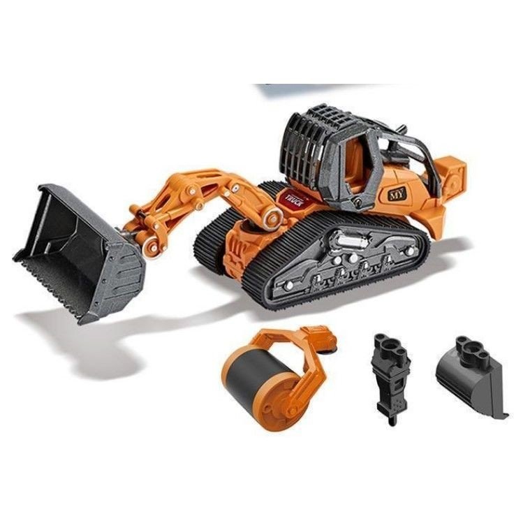 Модель трактора виконана у сучасному будівельному стилі з рухомими деталями. Набір включає змінні ковші, які дозволяють модифікувати техніку під різні ігрові завдання. Конструкція поєднує металеві та пластикові елементи, що робить іграшку міцною та стійкою до активної гри.