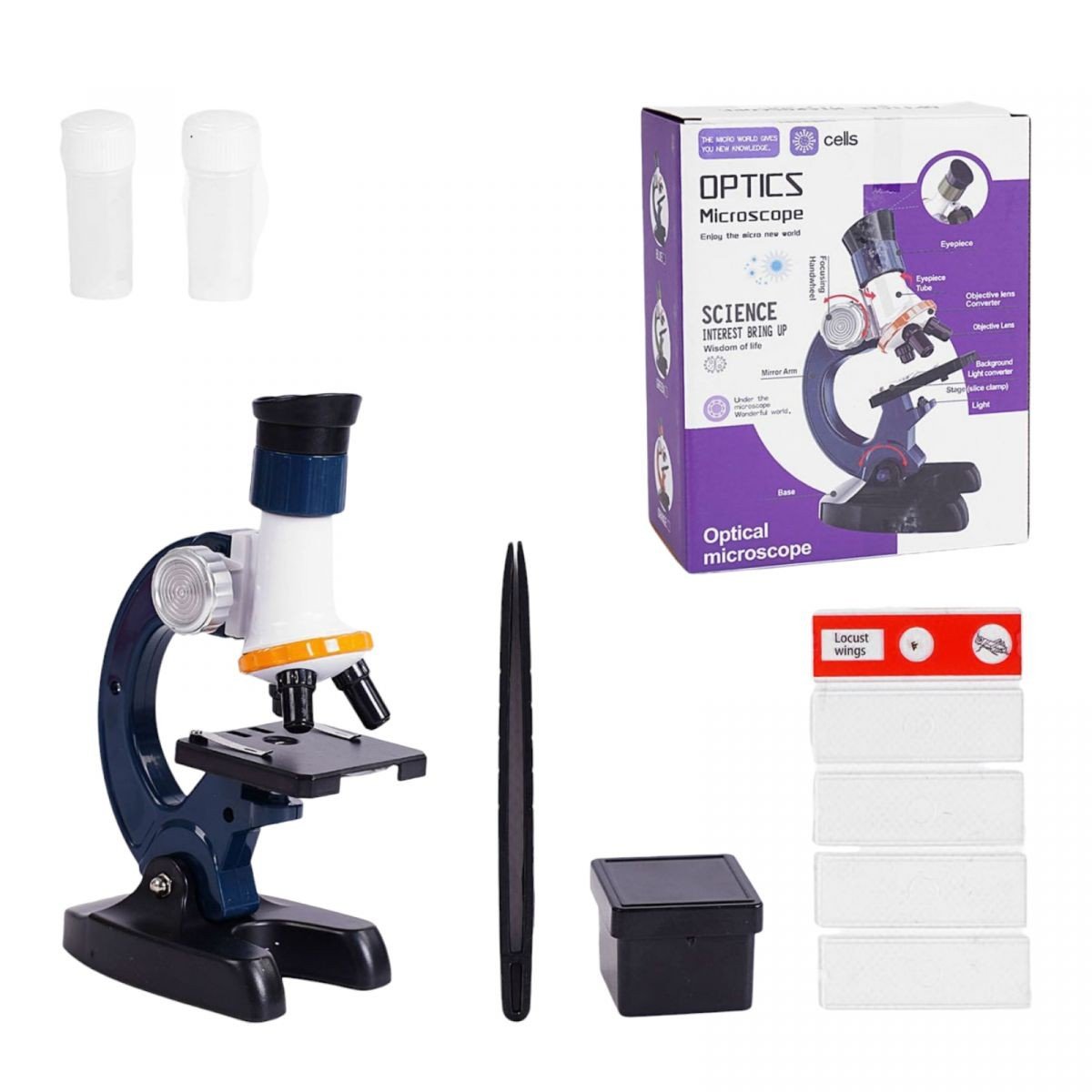 Модель дитячого освітнього мікроскопа, оснащеного підсвічуванням для забезпечення достатнього освітлення під час використання, збільшувальною лінзою та додатковим обладнанням, призначена для ігор та початкового знайомства дітей з наукою. З його допомогою можна побачити мікроскопічні обʼєкти з трьома режимами збільшенням; х100 / х400 / х1200, що дозволить розглянути найдрібніші предмети. Збільшення та зміна кольора підсвітки регулюється шляхом обертання деталей.
