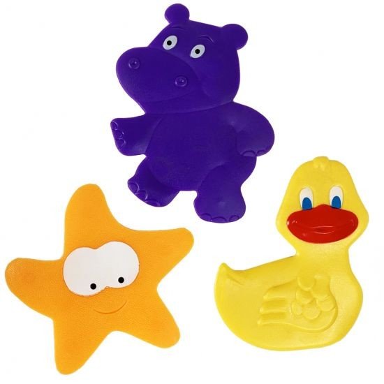 Набір яскравих, симпатичних міні килимків для купання (3 шт.). Килимки виконані у вигляді кумедних звіряток-персонажів. Кріпляться до поверхні за допомогою присосок. Розмір 1 килимка, приблизно, 12х11 см. Виконаний з якісних і безпечних матеріалів.