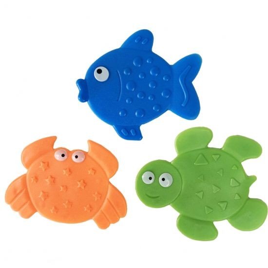 Набір яскравих, симпатичних міні килимків для купання (3 шт.). Килимки виконані у вигляді кумедних звіряток-персонажів. Кріпляться до поверхні за допомогою присосок. Розмір 1 килимка, приблизно, 12х11 см. Виконаний з якісних і безпечних матеріалів.