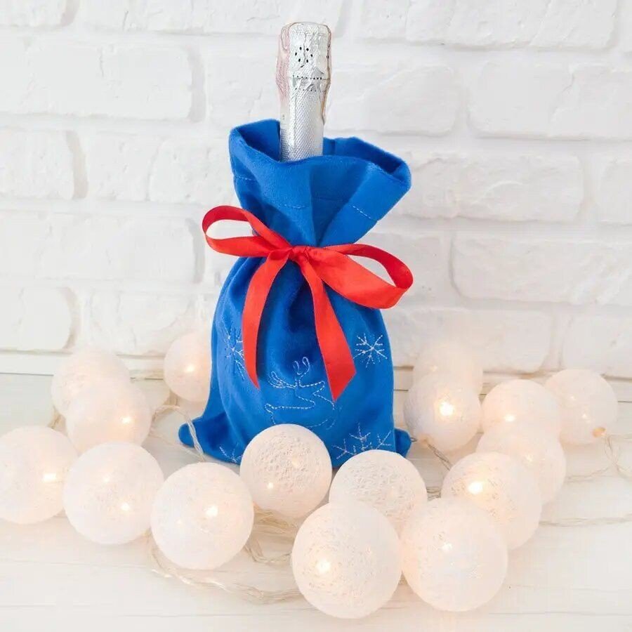 М'який мішок для шампанського з стрічкою. Допоможе прикрасити подарунок чи святковий стіл. Пляшку можна закріпити за допомогою стрічок. Розмір мішка: 30х20 см.