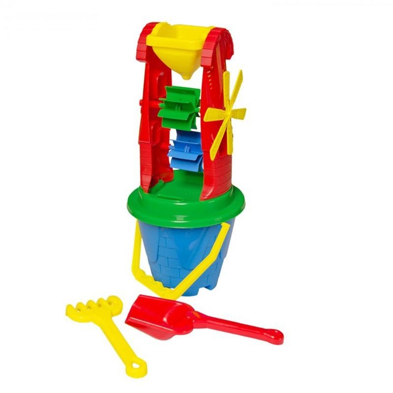 Оригінальна іграшка в формі вітряка з вікнами і млином. Два колеса під дією води або піску, які малюк наливає або насипає в контейнер, рухаються в протилежні сторони, приводячи в рух млин.