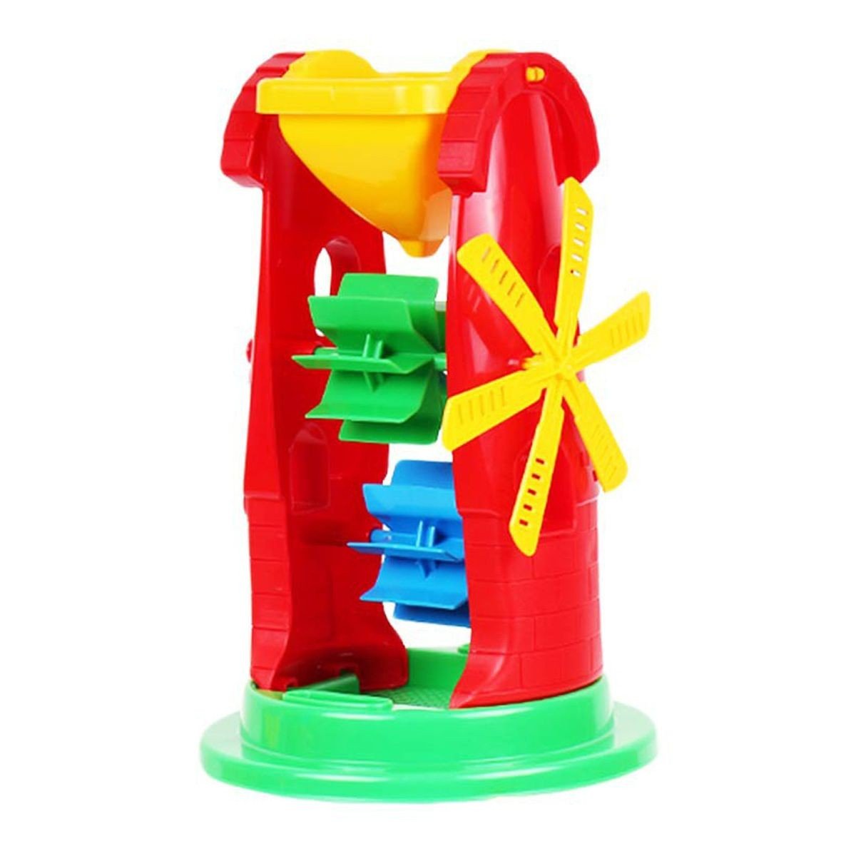 Оригінальна іграшка в формі вітряка з вікнами і млином. Два колеса під дією води або піску, які малюк наливає або насипає в контейнер, рухаються в протилежні сторони, приводячи в рух млин.