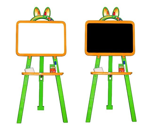 Дитячий мольберт 2 в 1. Плитка, розбірна, універсальна. У комплект входить: 2-х стороння дошка для малювання (1 сторона - біла, малювання маркером; 2 сторона - чорна, малювання крейдою), крейда, маркер, мочалка. Висота мольберта - 110-130 см.