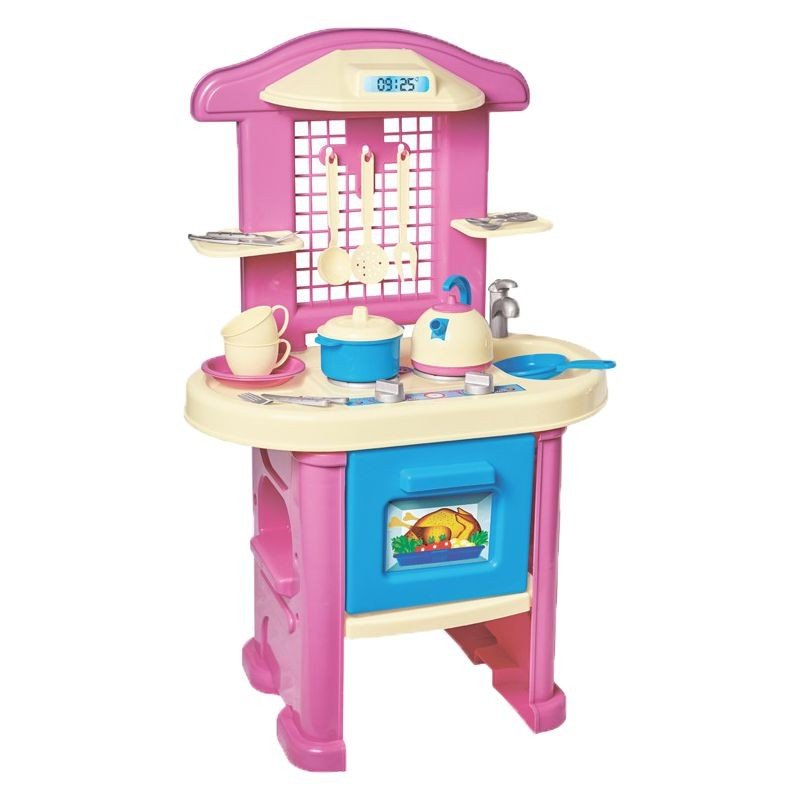 Моя перша кухня ТехноК. У комплект, крім самої кухні, входять також сковорідка, каструля, 2 тарілки, 2 чашки, столові прилади і чайник. Кришка духовки відкривається і в неї можна покласти посуд.