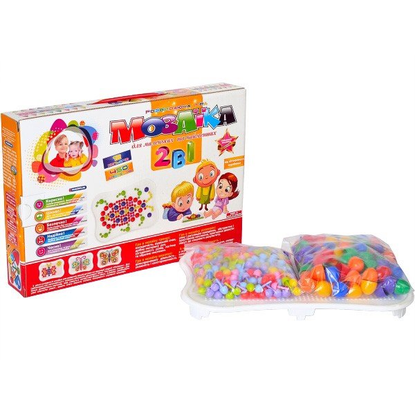 Мозаїка 2 в 1, 450 елементів. 12 кольорів. 100 великих деталей розміром - 2 х 3 см, 350 маленьких деталей розміром - 1 х 2,5 см. Розмір ігрового поля - 29 х 20,5 см. Розвиває уяву, абстрактне і просторове мислення.