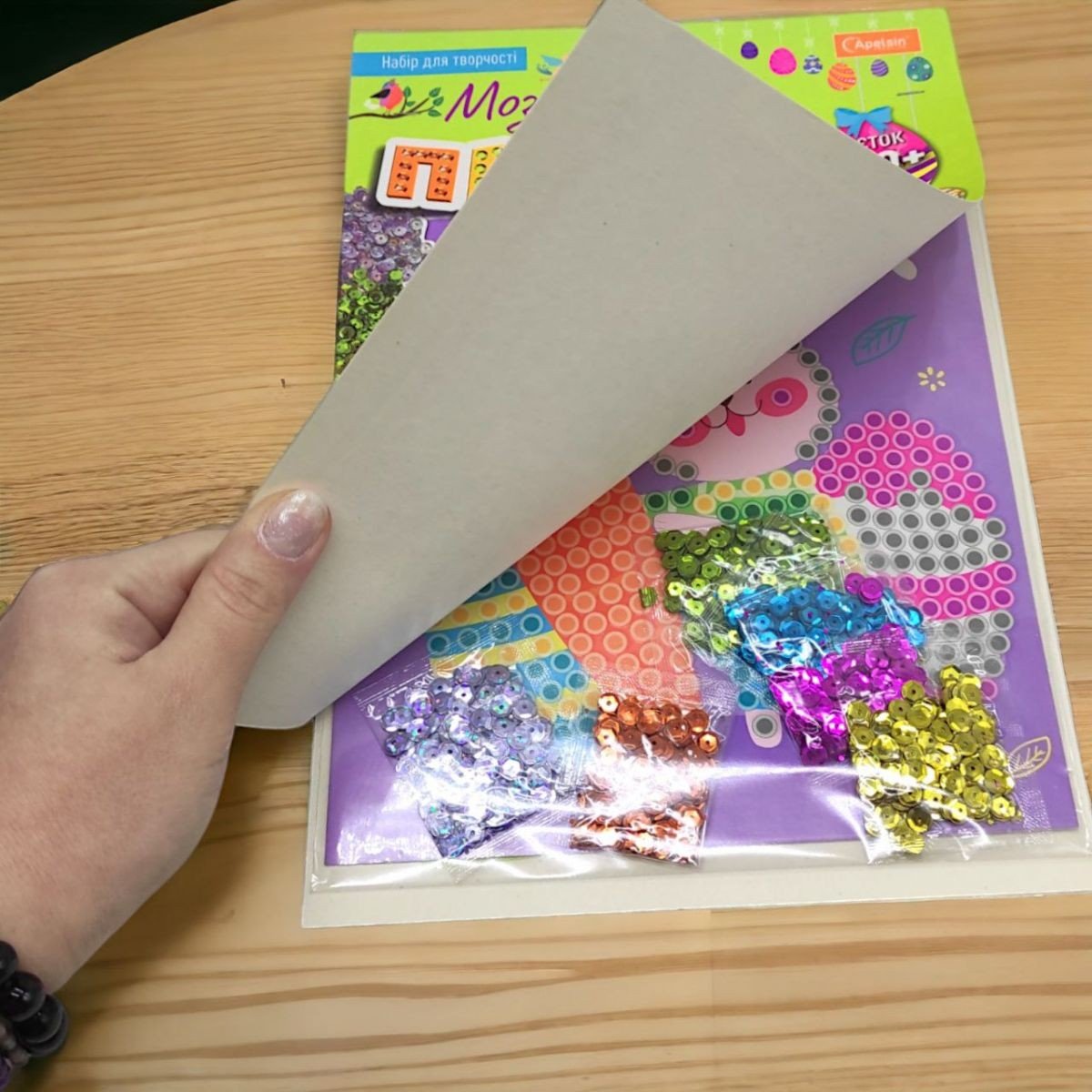 Набір для створення картини з паєток. З допомогою даного набору можна створити красиву мозаїку на великодню тематику. Принцип створення картини подібний до створення алмазної мозаїки: паєтки різних кольорів слід розміщувати по відповідним коміркам. Розмір виробу:20х25 см.