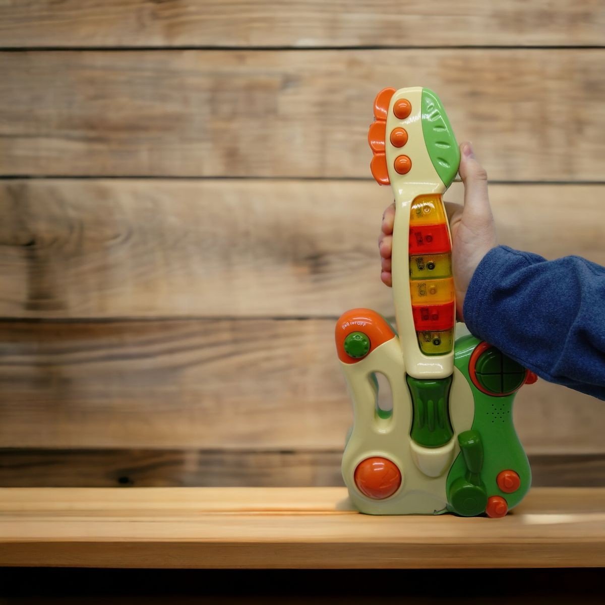 Інтерактивна гітара має багато рухомих елементів: клавіші, кнопочки та важіль, які додають веселощів та різноманітності в гру. Оснащена звуками нот, кумедними звуками та мелодіями, ця гітара стимулює творчість та розвиває музичні здібності у дітей. З кулькою-брязкальцем. Підсвічування. Працює від 3-х батарейок АА (немає в комплекті).