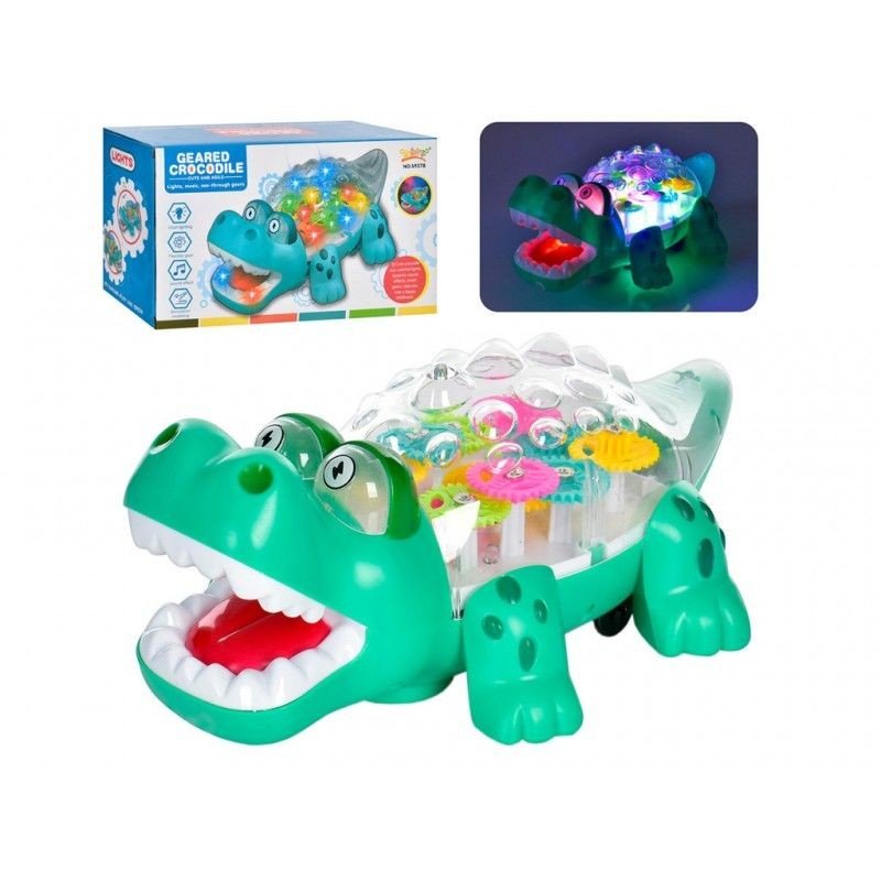 Музичні іграшки у вигляді крокодила. Їздить у різних напрямках, світиться яскравими вогниками, грає пісня Майкла Джексона – Beat It. Усередині обертаються кольорові шестерні. Розмір - 26 х 15 х 10 см. 2 види. Працює від 3-х батарейок АА (немає в комплекті).