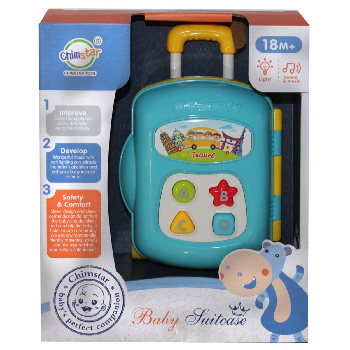 Інтерактивна музична іграшка у вигляді валізи на колесах із 4 кнопками. Ручка висувна. Оснащена звуковими ефектами (кумедні звуки та мелодії). Зі світлом. Розмір - 10 х 5 х 14 см.
