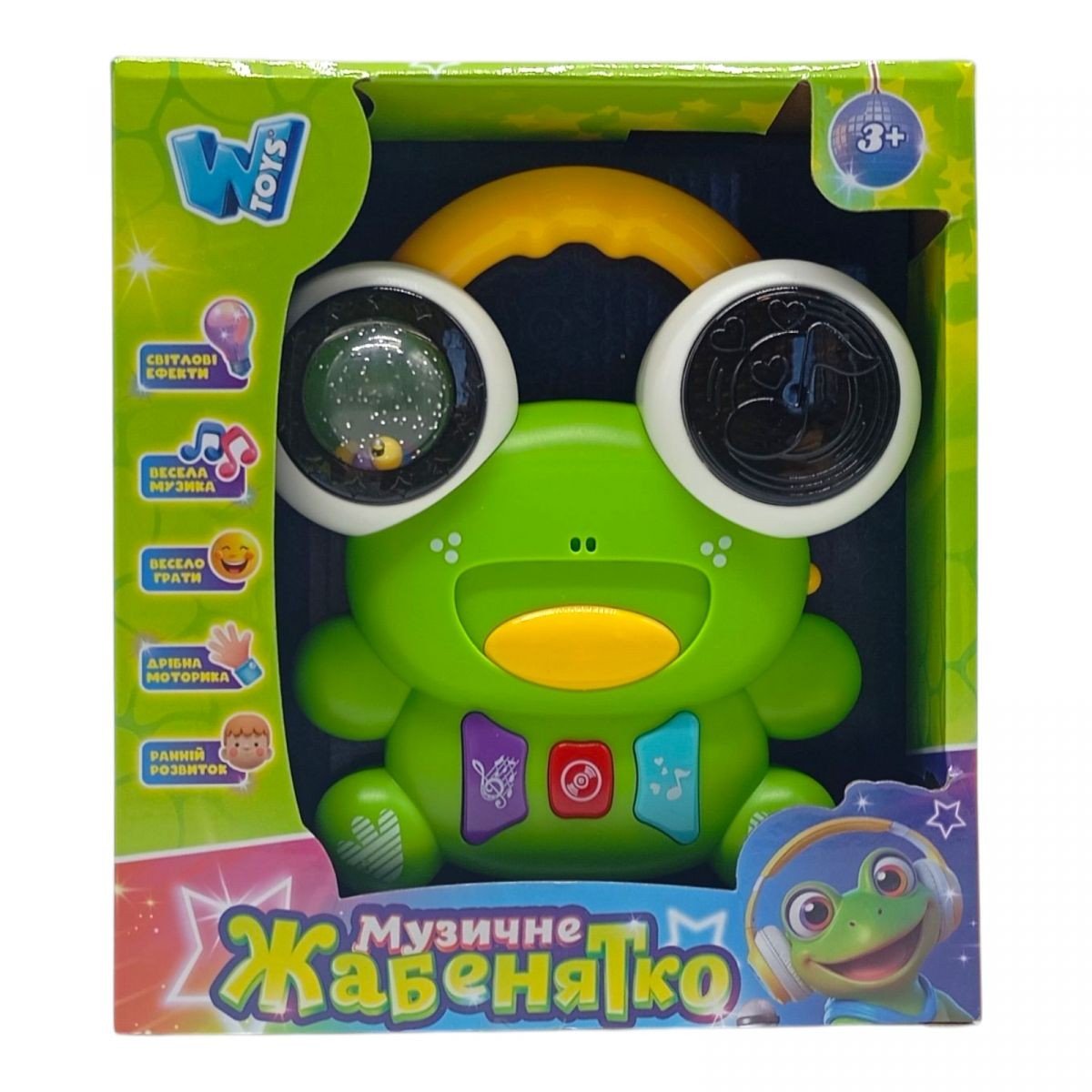 З музичним жабенятком у нудьги немає жодних шансів! Іграшку озвучено українською мовою, тож вона чудово допоможе малюкові з раннім розвитком мовлення. Цей яскравий музичний інструмент, стилізований під тваринку, також є мініпрогравачем, на якому дитина зможе прослухати записи цікавих та повчальних казок, а також веселих пісень, окрім цього ще можна увімкнути мудрі скоромовки та іграшка імітує звуки барабанів! Одне око жабенятко виконано у вигляді брязкальця. Розвиває дрібну моторику, музикальний слух та покращує увагу.
