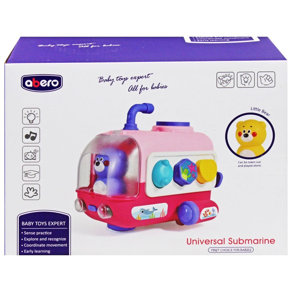 Музична іграшка-сортер "Субмарина" із боцманом у вигляді чарівного ведмедика. З боків підводного човна розташовані віконця різних форм, у які дитина зможе вставляти відповідні фігурки. Кожна фігурка в наборі наповнена маленькими кульками, які видають звук, що нагадує брязкальце. При включенні у субмарини починають світитись фари, іграшка відтворює дитячі мелодії. Довгим натисканням на кнопку включення можна включити режим їзди: субмарина їздитиме у довільних напрямках. У наборі є шнурок, який можна прикріпити до іграшки і возити її за собою. Розмір іграшки у зібраному вигляді: 20х27х12 см.