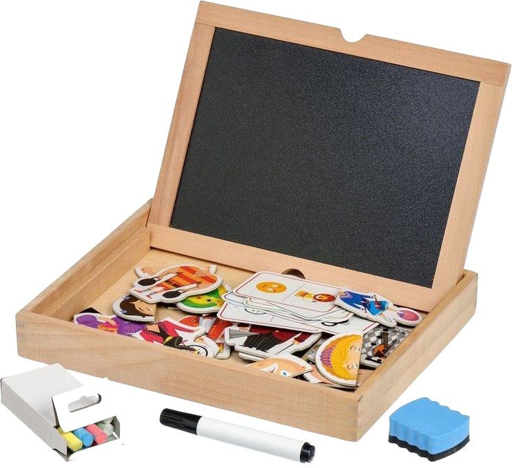 Бренд: Lucy&Leo Упаковка: Коробка Колір: Різнобарв'я Вага з упаковкою: 1020 г Габарити в упаковці: 23 x 30 x 4 см Країна виробник: Китай Матеріал: Комбінований Комплектація: 10 магнітних фігурки (по 3 елементи), двостороння дощечка, маркер, набір кольорової крейди, губка