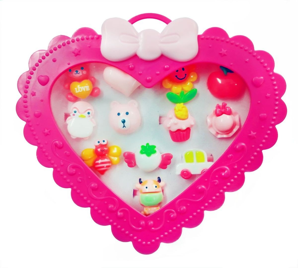 Набір милих дитячих каблучок в гарній упаковці-коробочці у вигляді сердечка. Кільця прикрашають різні фігурки у вигляді тварин, фруктів і квіточок. Виготовлені з пластику. 12 штук в комплекті.