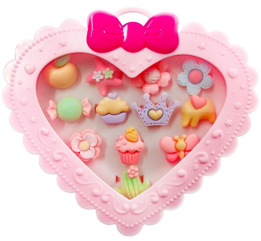 Набір милих дитячих каблучок в гарній упаковці-коробочці у вигляді сердечка. Кільця прикрашають різні фігурки у вигляді тварин, фруктів і квіточок. Виготовлені з пластику. 12 штук в комплекті.