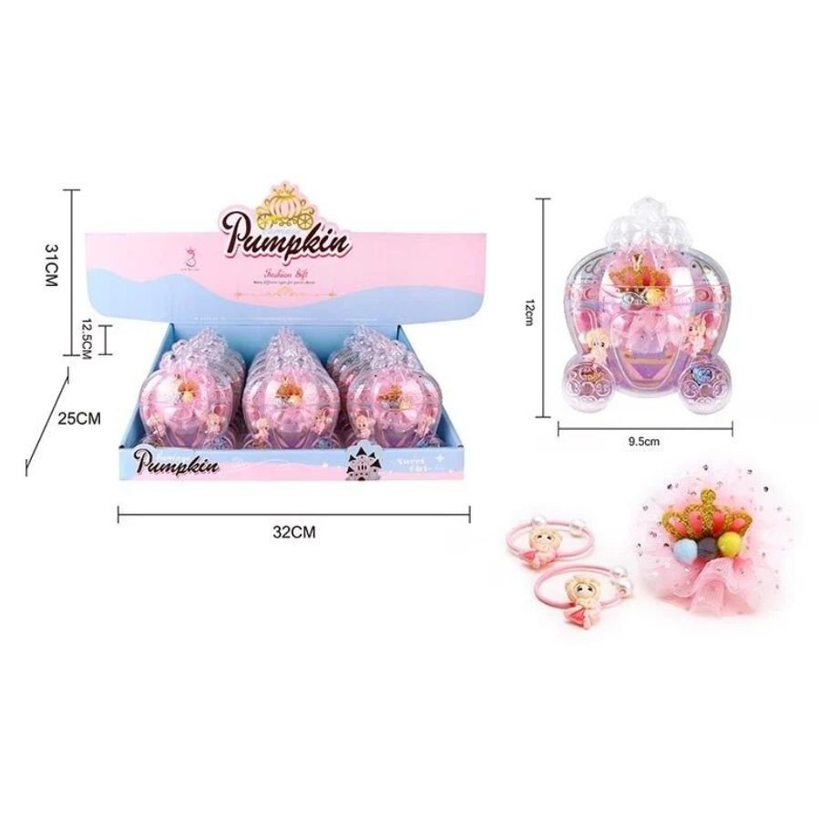 Набір милий дитячі прикраси в красивій упаковці коробку у вигляді карети. У комплекті є 2 гумки для волосся та оригінальна шпилька. Виготовлені із міцного пластику. Прикраси допоможуть дитині доповнити образ на свято або просто у повсякденному житті. Виконано з якісних та міцних матеріалів.