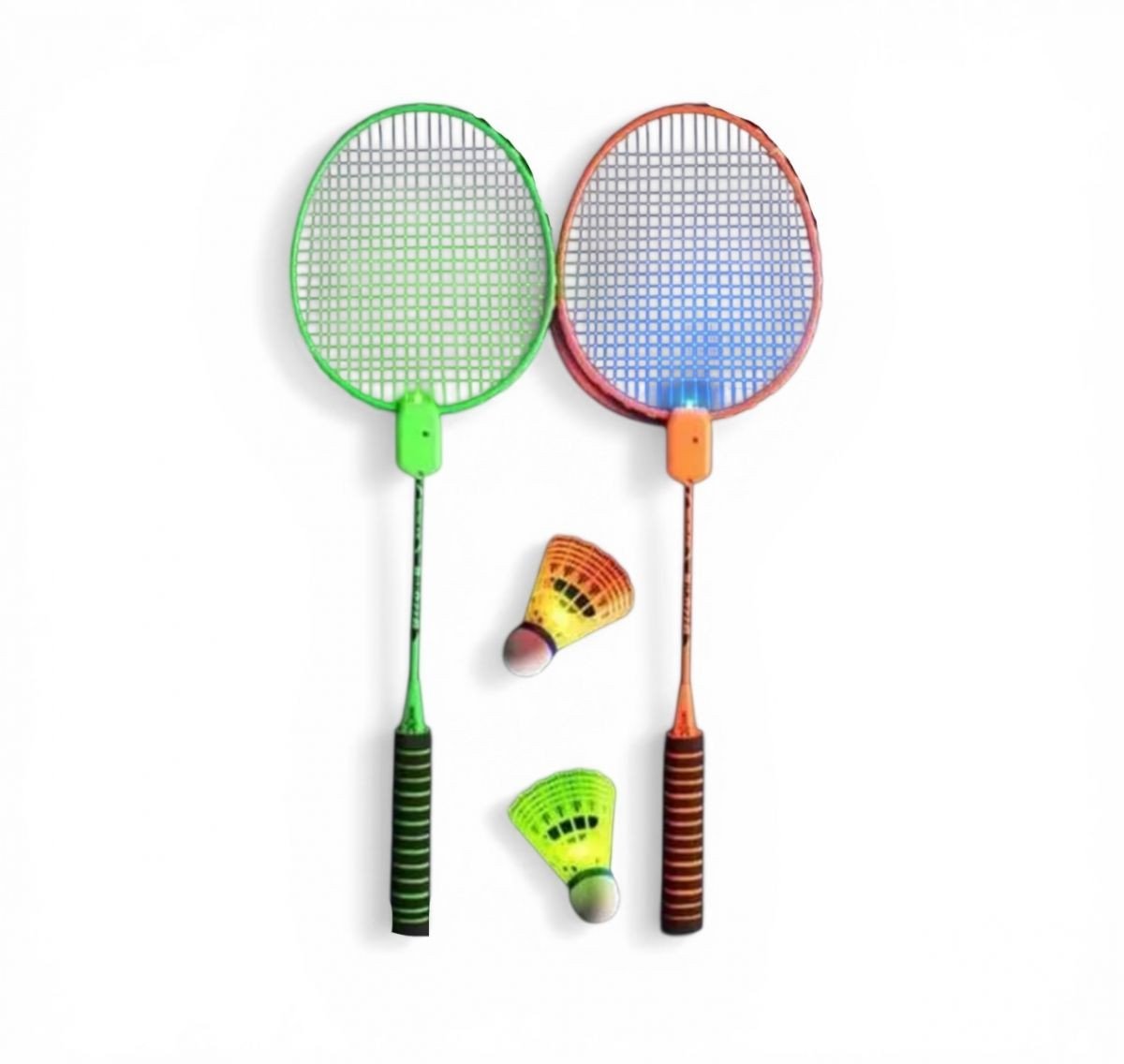 Ігровий комплект дозволяє насолоджуватись бадмінтоном навіть у вечірній час. До набору входять дві ракетки зі світлодіодним підсвічуванням та три волани, що світяться під час польоту. Завдяки цьому гра стає видовищною та помітною у темряві. Легка конструкція ракеток і зручні ручки забезпечують комфорт під час активного відпочинку на вулиці.