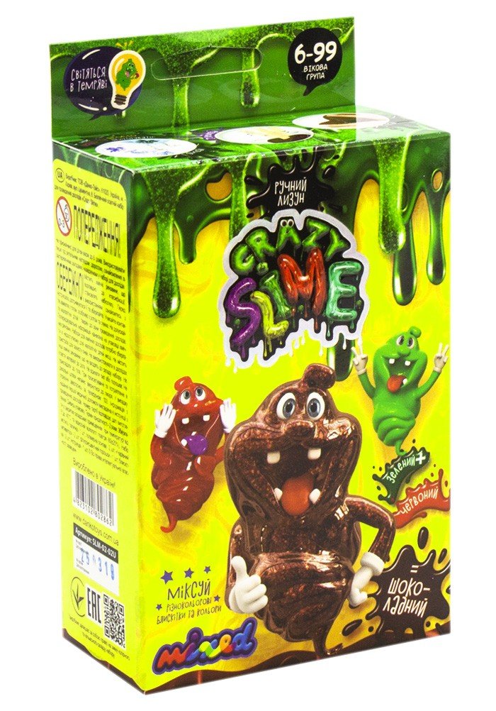 Набір для дослідів "Crazy Slime - Лизун своїми руками". З даними набір Ви зможете виготовити своїми руками "ручного Лизуна". Все що для цього потрібно, є в комплекті. Готовий лизун можна м'яти, розтягувати, роздувати, а якщо при "приготуванні" Лизуна добавать в нього флюорісцентний порошок, то він ще й буде світиться в темряві. 2 кольори - зелений + червоний = шоколадний. Є детальна, покрокова інструкція