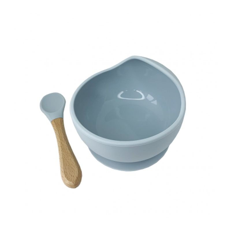 Набір для годування дитини. У комплекті є: силіконова мисочка і ложечка з дерев'яною ручкою. У мисочки є присоска і бортик (з одного боку), який перешкоджає проливанню їжі. Довжина ложечки - 14 см. Виконано з якісних і безпечних матеріалів.