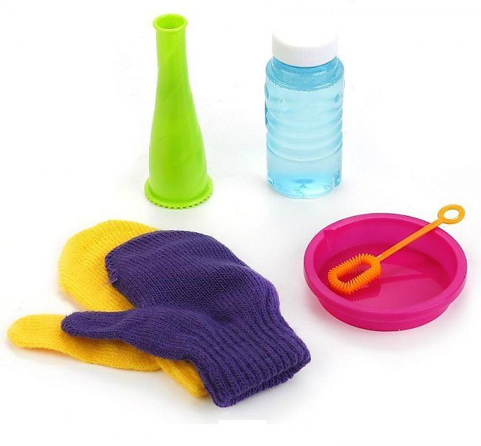 Особливість наборі - наявність рукавиць, які потрібні для того, щоб під час гри, дитина не забруднився в милі. Мильні бульбашки потрібно налити в тарілочку і за допомогою спеціального пристрою надути великий міхур (10 см).