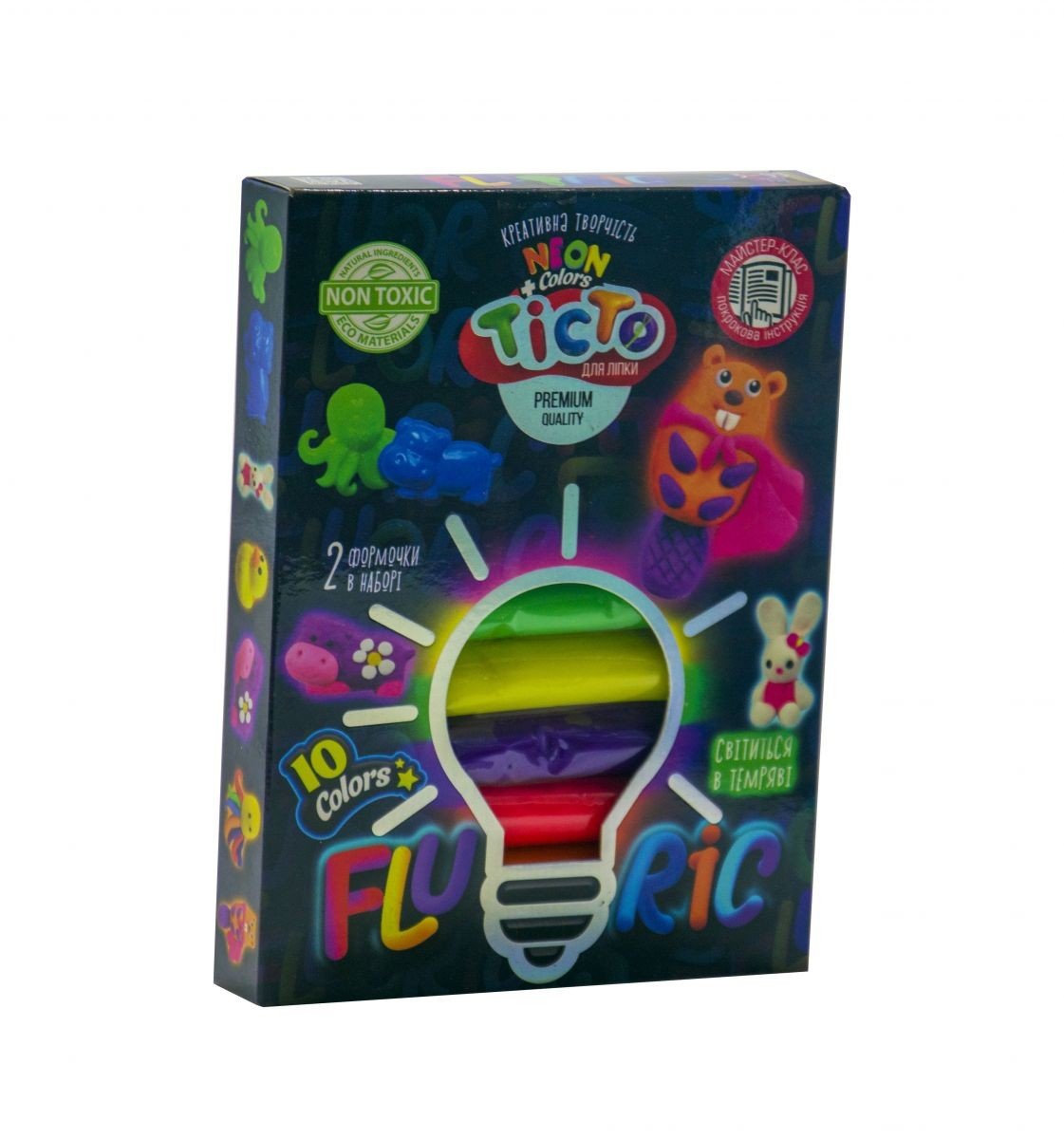 Тісто "Fluoric" - це набір креативної творчості, унікальність якого полягає в складі матеріалу і його дивну здатність - світиться в темряві. 10 кольорів тесту (по 15 г), 2 формочки і стек в наборі