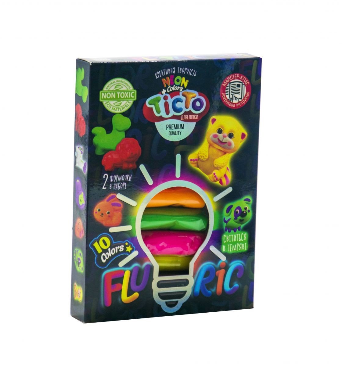 Тісто "Fluoric" - це набір креативної творчості, унікальність якого полягає в складі матеріалу і його дивну здатність - світиться в темряві. 10 кольорів тесту (по 15 г), 2 формочки і стек в наборі