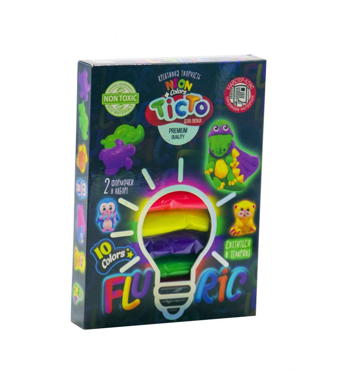 Тісто "Fluoric" - це набір креативної творчості, унікальність якого полягає в складі матеріалу і його дивну здатність - світиться в темряві. 10 кольорів тесту (по 15 г), 2 формочки і стек в наборі
