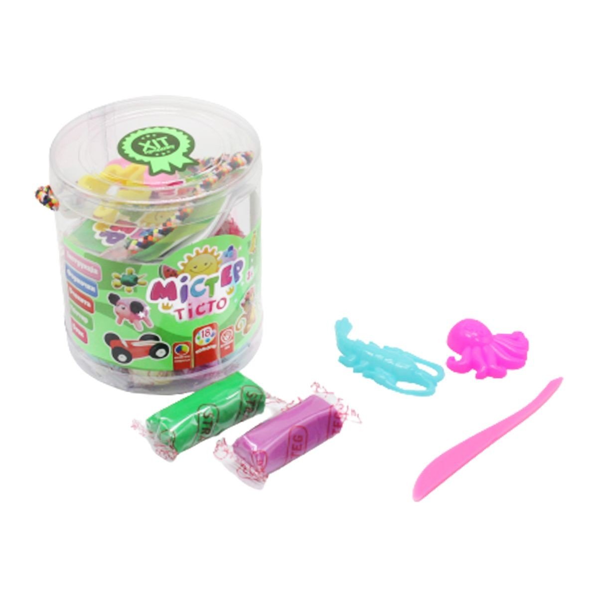 Упаковка: Баночка Колір: Різнокольоровий Вага з упаковкою: 390 г Габарити в упаковці: 10 x 11.5 x 10 см Країна виробник: Україна Матеріал: Комбінований Комплектація: тісто для ліплення - 18 брусочків в індивідуальній упаковці, очі - 2 шт., стек - 1 шт., гліттер - 1 шт