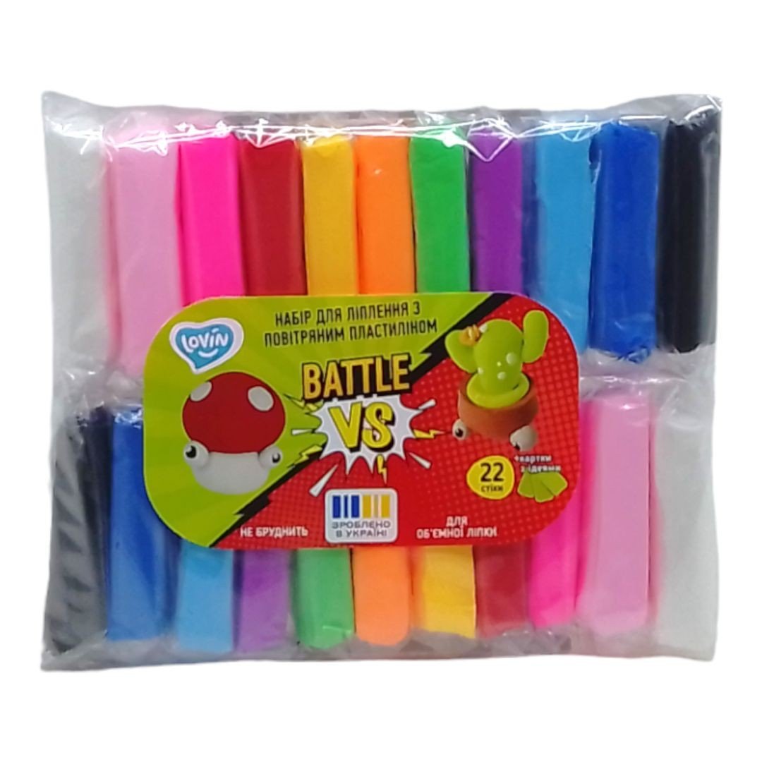 Влаштуйте справжню дуель по ліпленню з набором для творчості "Батл 11 vs 11 кольорів"! Цей комплект стане чудовим подарунком для дітей і дорослих, які люблять створювати щось власними руками. Учасники змагаються у швидкості або якості ліплення, створюючи свої фігурки за обраними зразками або за власною уявою. 22 стіки повітряного пластиліну (2 по 11 кольорів), 2 інструменти і 3 картки (6 зразків персонажів, яких можна ліпити) у комплекті.