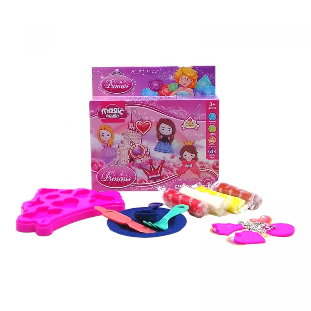 Яскравий набір для ліплення із повітряним тістом, виконаний у тематиці чарівних принцес. У комплекті є 4 стіка з тестом різних кольорів, велика форма у вигляді корони, посуд (тарілка, вилка, ложка та ніж), а також набір для створення милих брелочок своїми руками. Набір виконаний із якісних та безпечних матеріалів. Для дітей віком від 3-х років.