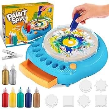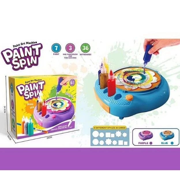 Створення картин дріппінгу стає простим завданням із цим універсальним набором! Просто увімкніть обертову машину, покладіть на неї дошку для малювання та використовуйте фарби з набору, щоб намалювати все, що забажаєте. З 36 дошками для малювання та 7 різними кольорами фарб на вибір ви зможете створити чимало картин.
