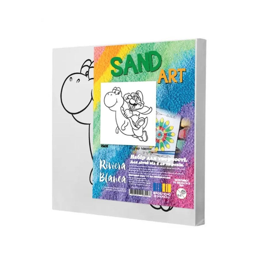 Набір для малювання піском буде цікавим для дітей різних вікових категорій. Малювати піском просто. На контур, розбитий за номерами на справжньому полотні для художників, наносимо клей, трошки чекаємо та починаємо створювати свій шедевр за допомогою різнокольорового піску. Кожен номер на полотні вказує на певний відтінок піску. А коли робота буде завершена, ви отримаєте свій власний дивовижний витвір мистецтва. До комплекту входить: полотно на деревʼяному підрамнику, клей, кольоровий пісок, пензлик. Розмір картини - 25х25 см.