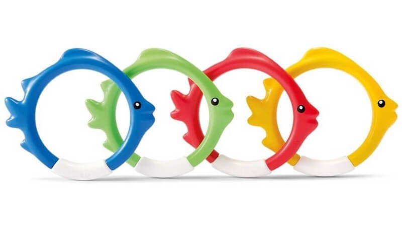 Являють собою невеликі кільця з грузиками. Завдання батьків розкидати їх по периметру, під водою вони будуть знаходиться в вертикальному положенні. Діти будуть їх збирати. Хто більше зібрав, той і переміг. У наборі 4 кольори.