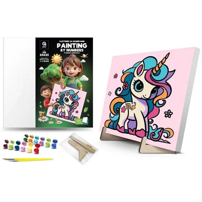 Дитяча картина за номерами. Для того, щоб намалювати картину, необхідно малювати за пронумерованими контурами, які відповідають кольору фарби. У наборі: полотно на підрамнику з галерейною натяжкою, художні нейлонові пензлі, палітра акрилових фарб у контейнерах, деревʼяні деталі підставки для картини. Усі необхідні фарби вже в комплекті та не вимагають змішування. Розмір: 25х25 см. Рекомендовано для дітей старше 5 років.