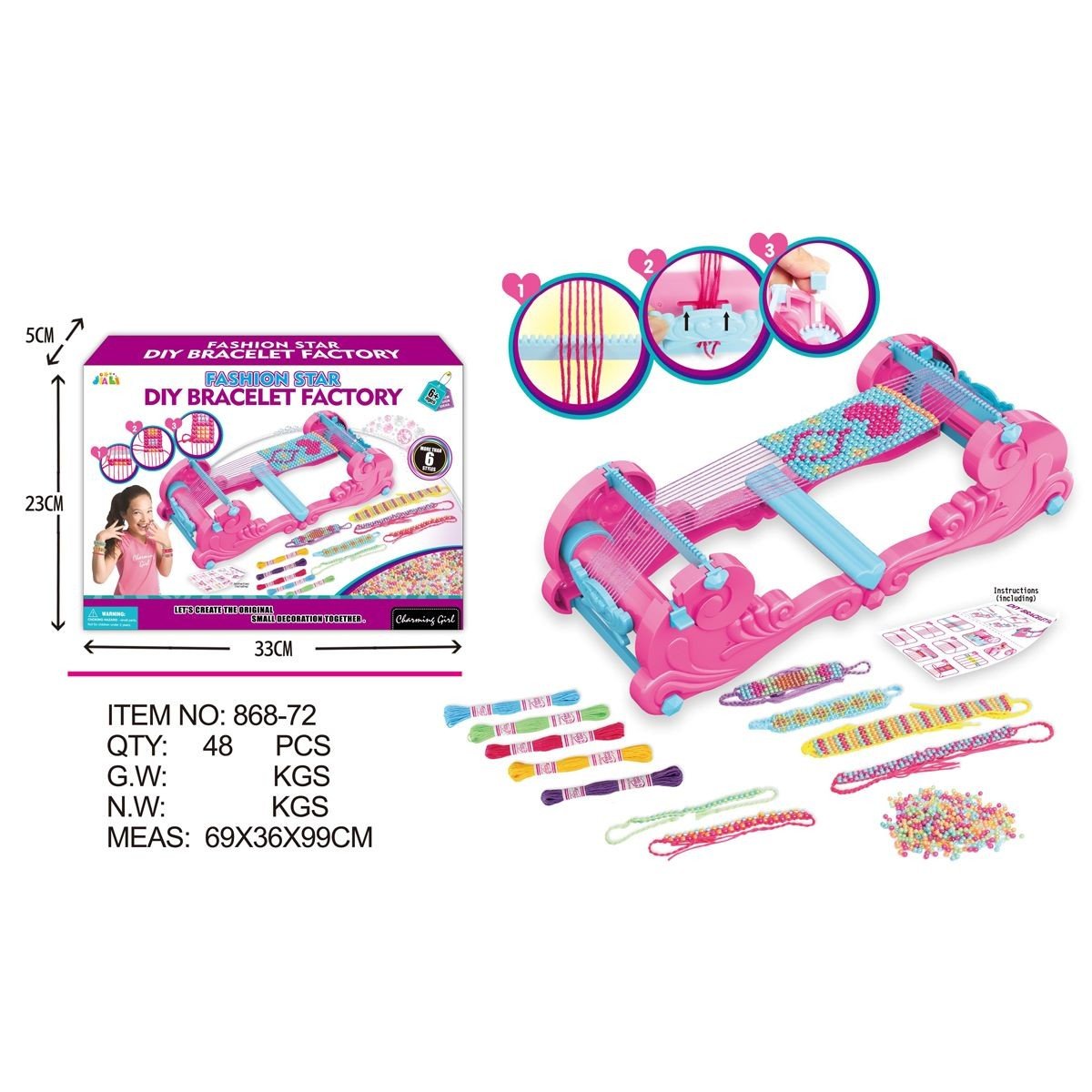 Ігровий набір для створення прикрас з бісеру. З першої спроби легко можна створити рівні, красиві і яскраві прикраси. У набір входить: верстат для бісероплетіння, завдяки якому можна виготовити будь-які прикраси; різнокольорові намистини; 5 мотків різнокольорових ниток.