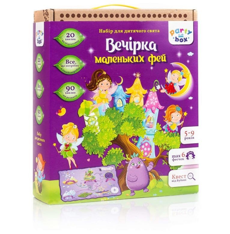 Яскравий і захоплюючий Party Box. Усередині коробки - захоплюючий квест, який стане чудовим варіантом проведення Дня Народження маленької феї. Призначений для 6-ти дітей, віком від 5 до 9 років. Триває квест приблизно 1,5 години. У наборі є все необхідне для проведення квесту: інструкція, сценарій, буклет, запрошення (5 шт), наклейки (56 шт), прапорці (6 шт), шнур для прапорців, прикраси для столу (6 шт), крильця (6 шт) , прикраси-камінчики для крил (30 шт), гумки для крилець (6 шт), дзеркальце, карткова гра "Фанти", гра "Шкарпетки Троля" (14 пар і троль), листи від бубонної (5 шт), карта, кристал єдинорога, стакан, скрижаль пошуку, плакат для побажань, конвертики для побажань (5 шт), листи для побажань (8 шт), чарівні квіти (9 шт), пилок, етикетки на пляшку (2 шт), ворожіння "коли я виросту. .. "(13 листочків), палички для фей, корона іменинниці, фото тролів, листівка для батьків.