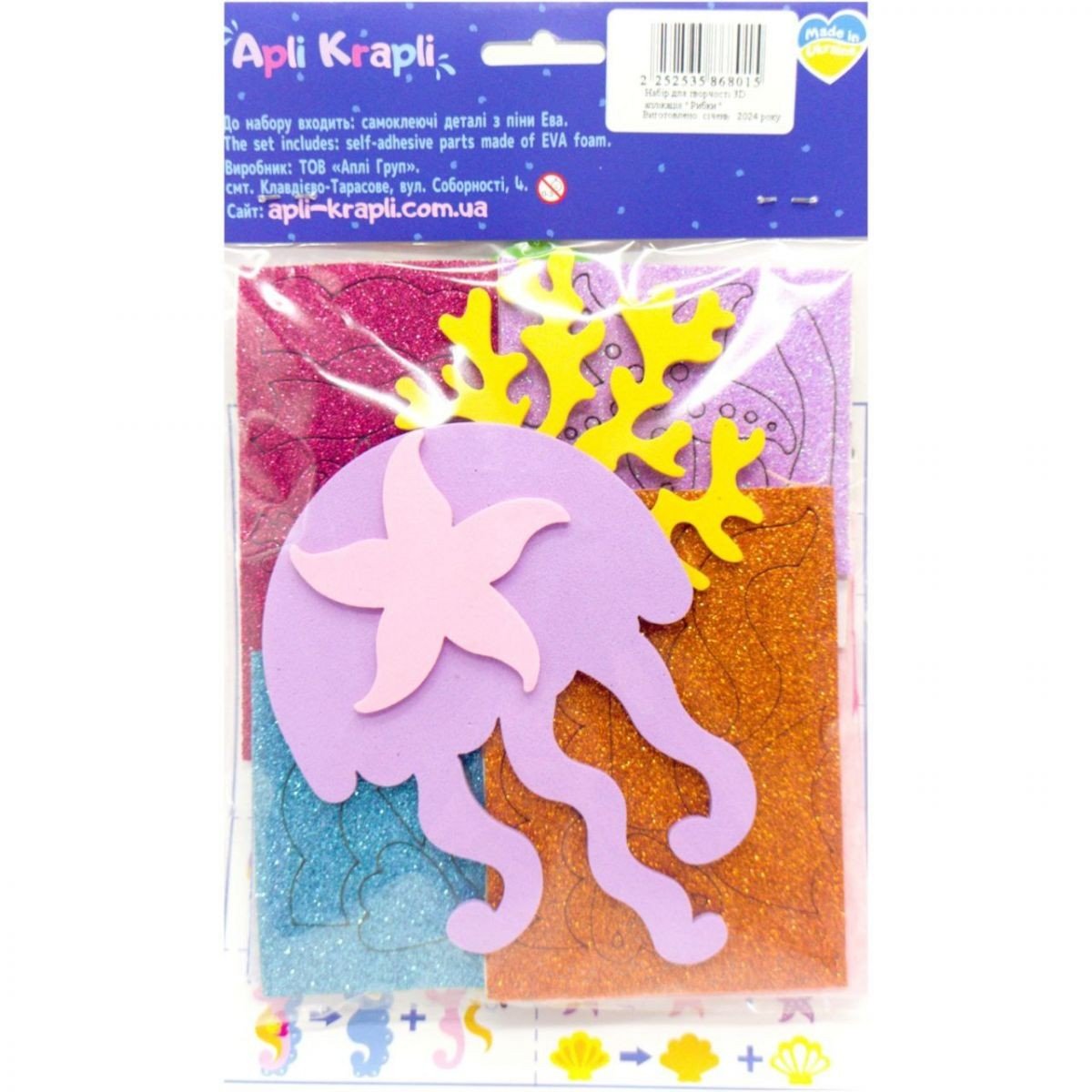 Набір для творчості "3D аплікація" від українськаго бренду Аплі Краплі. З деталей набору можна створювати яскраві та незвичайні поробки-аплікації. До комплекту входить все необхідне: самоклеючі деталі з EVA та двосторонній скотч. На упаковці зображено покрокову інструкцію. Рекомендовано для діток старше 3-х років.