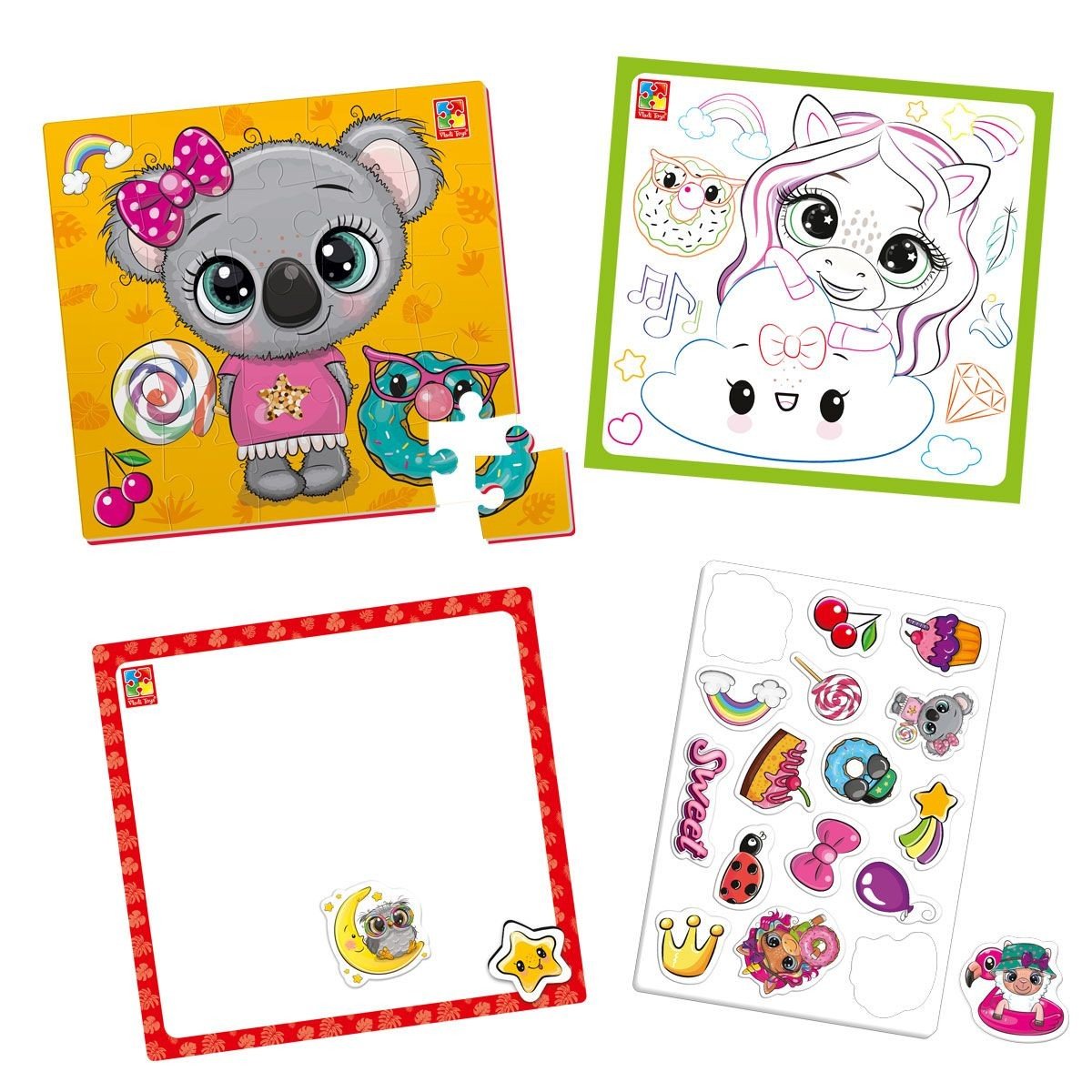 Набір для творчості оригінальний подарунок для дитини на день народження або будь-яке свято. Починаючи з малих наборів дитина познайомиться з різними видами творчості та розвине відчуття смаку. Комплектація: пазл на 25 елементів, розмальовка, 16 наліпок, поле для декорування. Виконаний набір з якісних та безпечних матеріалів