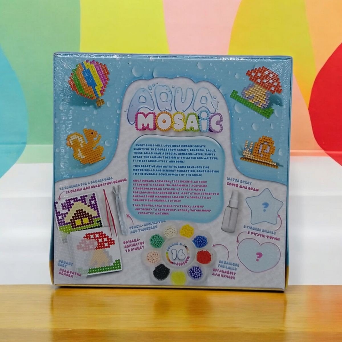 Набір для творчості сподобається кожній дитині. З його допомогою можна створювати красиві 3D малюнки власноруч із різнокольорових кульок. Кульки мають спеціальний клейовий шар. Досить збризкати викладений малюнок водою і почекати до повного висихання. У наборі є: 22 схеми для квадратної основи, квадратна основа, олівець-аплікатор та пінцет, органайзер для кульок, кульки у 16 кольорах, контейнер-срей для води, 2 фігурні форми. Для дітей віком від 6-ти років.