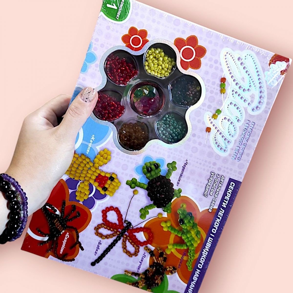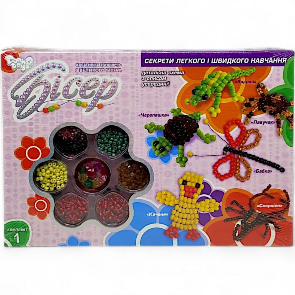 Набір для творчості "Бісер". В даному наборі Ви знайдете безліч видів бісеринок, які відрізняються за кольором і розміром, спеціальну міцну нитку-лісочку для нанизування намистин, а також докладну інструкцію з описом і схемами прикрас, які можна зробити за допомогою цього набору. Набір для виготовлення 5 виробів.
